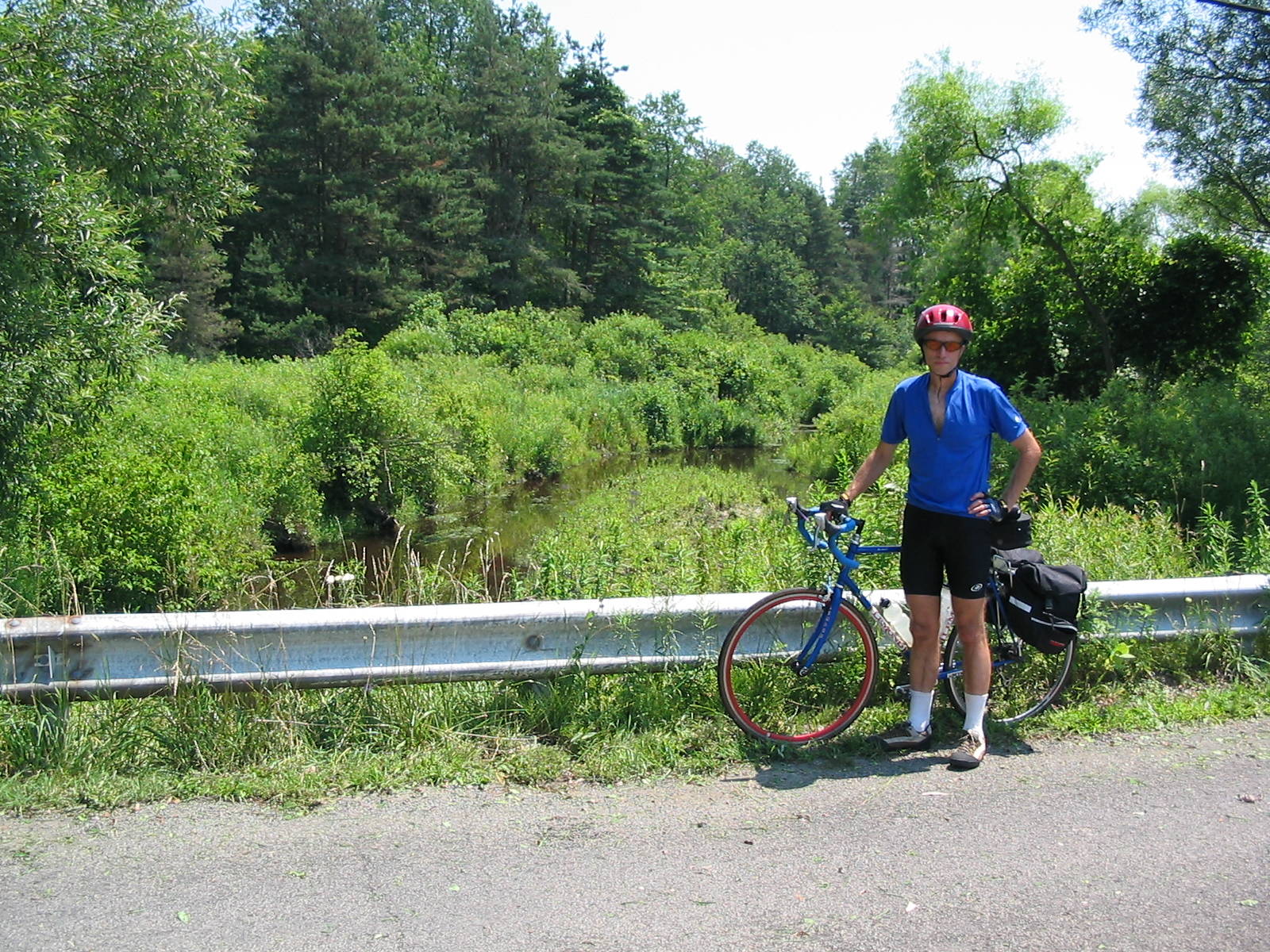 After our delicious DQ lunch it is noticeably hotter. We climb on our bikes and Jim leads the way out of the parking lot. A guy in an SUV speeds up, honks at Jim, and yells, "can't you see a car coming," as Jim leaves the parking lot. Then Mr. SUV proceeds another 100 feet and stops at a red light. I guess Jim really held him up from getting to that red light. We start riding down Dunham Rd. and look back - Mr. SUV is still at that red light. Dunham Rd first goes through an industrial park but then a pretty wetland appears on our right. We turn on Moisiertown Rd. and then come to Townhomes Rd. Unfortunately it's a dirt road. The drill now is get out the map and look for an alternate route. We are deciders, so we decide to continue on Moisertown to Highway 198. We start noticing a slight wind from the west. There's not much of a wind and it's only a crosswind. No problem!We follow Highway 198 to Grange Center Rd. where a friendly local stops his vehicle and confirms for us that this is the road we want. We are finding many intersections without street signs, which makes navigating harder. By this time it's really hot - in the 90s and humid. It's also a very pretty July day. We ride Grange Center Rd. to Gospel Hill Rd. and then get on Fry Rd. Fry Rd. goes straight north for many miles and will take us, much of the way to Erie, PA.